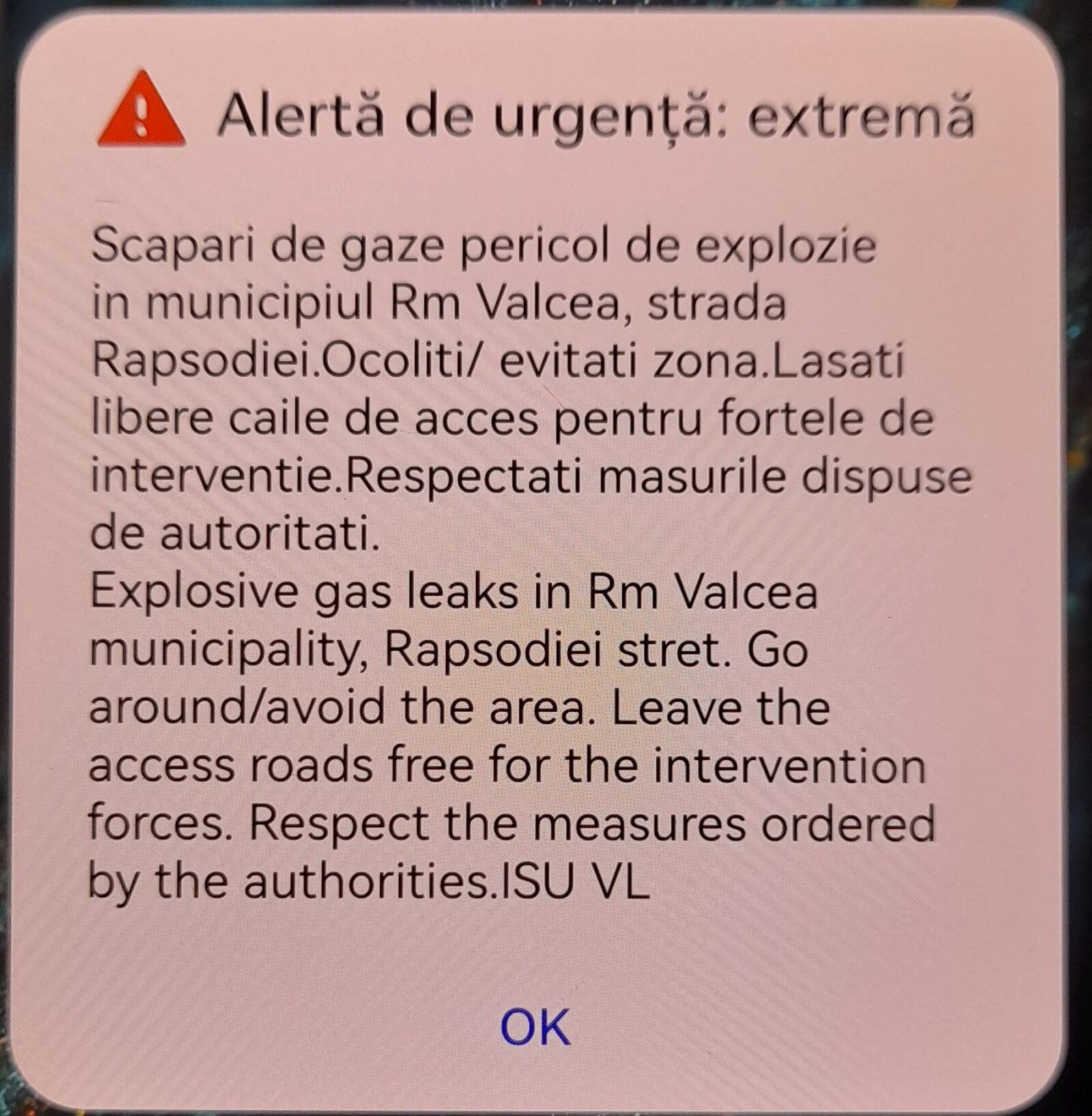La ora 11:22 a fost emis mesaj RO-ALERT pentru informare și protejarea populației din zona evenimentului.