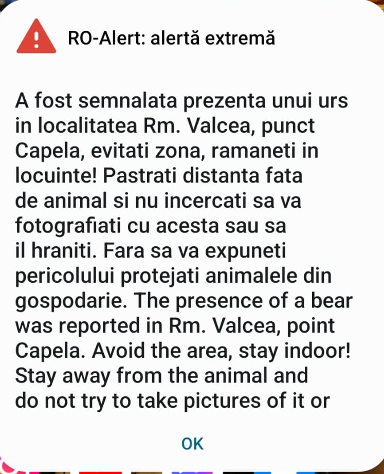 „A fost semnalată prezenţa unui urs în localitatea Râmnicu Vâlcea, punctul Capela. Evitaţi zona! Rămâneţi în locuinţe! Păstraţi distanta faţă de animal şi nu încercaţi să-l hrăniţi sau să vă fotografiaţi cu acesta! Fără să vă expuneți pericolului, protejați animalele din gospodărie”, a transmis ISU Vâlcea.