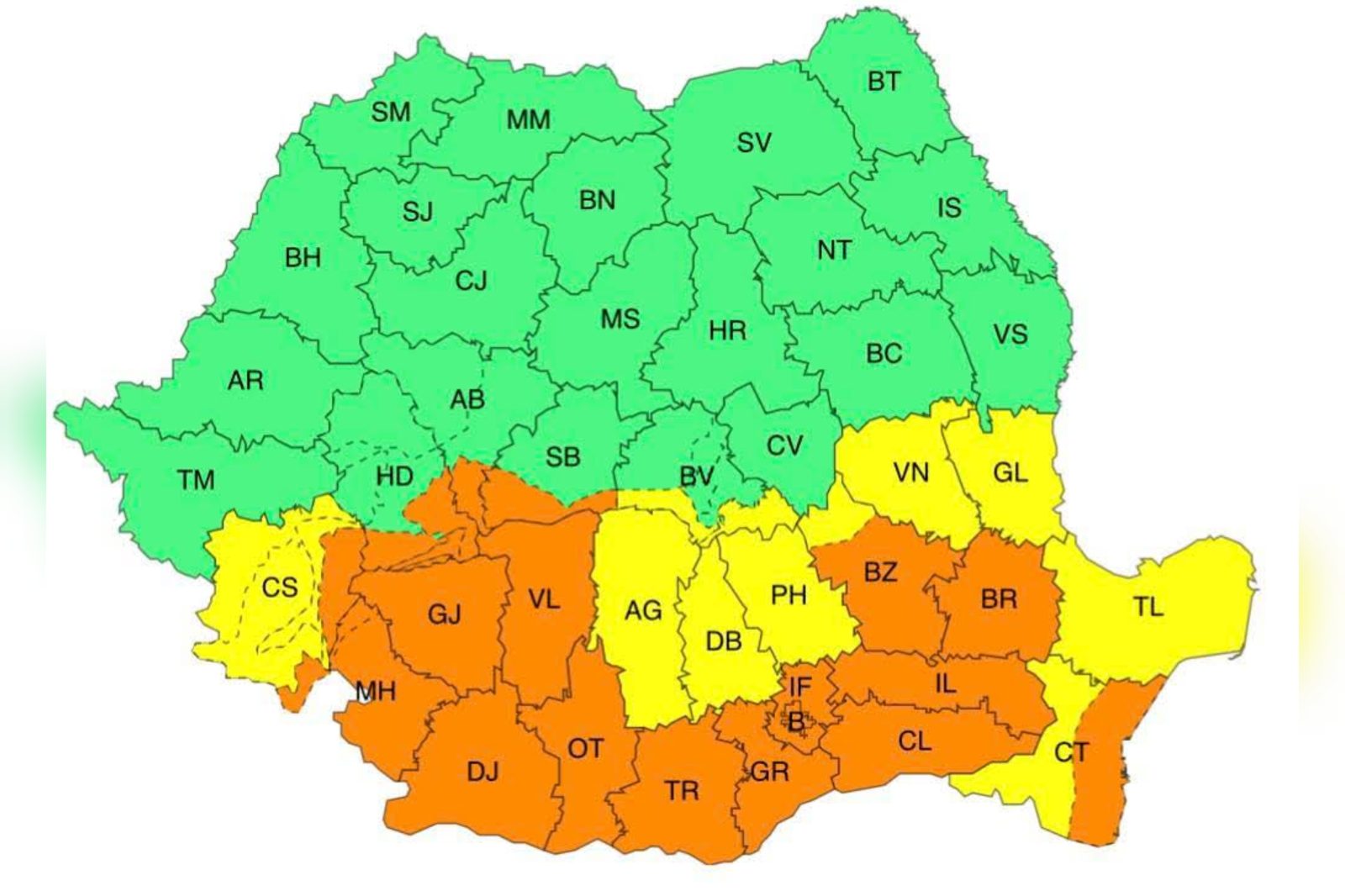 Cod portocaliu de ploi – În județele Mehedinți, Dolj, Olt, Vâlcea și Gorj sunt așteptate precipitații abundente, cu acumulări de 50–70 l/mp, ceea ce poate conduce la inundații locale și probleme în trafic.