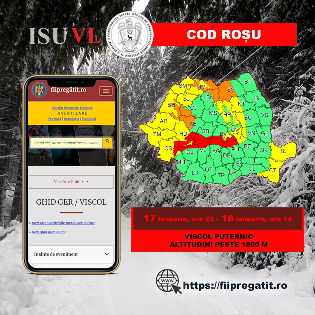 ANM a emis și o avertizare de cod roșu de viscol puternic,pentru intervalul 17 ianuarie, ora 22.00 – 18 ianuarie, ora 14.00.