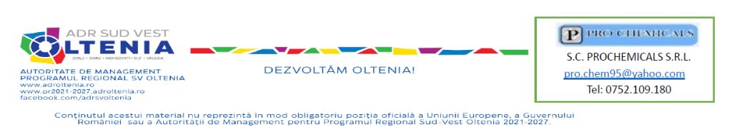 S.C. PRO CHEMICALS S.R.L., în calitate de Beneficiar, și Agenția pentru Dezvoltare Regională Sud-Vest Oltenia, în calitate de Autoritate de management pentru Programul Regional Sud-Vest Oltenia 2021-2027(AM PR SV Oltenia), au semnat Contractul de finanțare nerambursabilă nr. 446/13.05.2025 pentru proiectul „Achiziționarea de utilaje, în cadrul S.C PRO CHEMICALS S.R.L”, cod SMIS 323430.