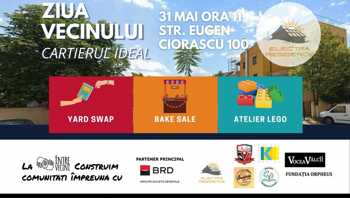 YARD SWAP, pentru care vă ȋncurajăm să aduceți, copiii – câte o jucărie, iar adulții – câte o carte sau alt obiect reprezentativ, dar pe care poate nu ȋl mai folosiți cu care să facem schimb ȋntre noi și să păstrăm apoi un memento al zilei, primit de la alt vecin.