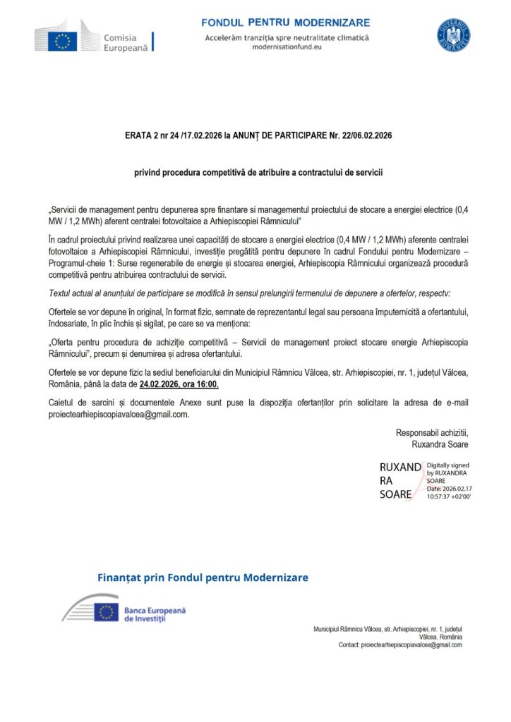 ERATA 2 nr 24 /17.02.2026 la ANUNȚ DE PARTICIPARE Nr. 22/06.02.2026