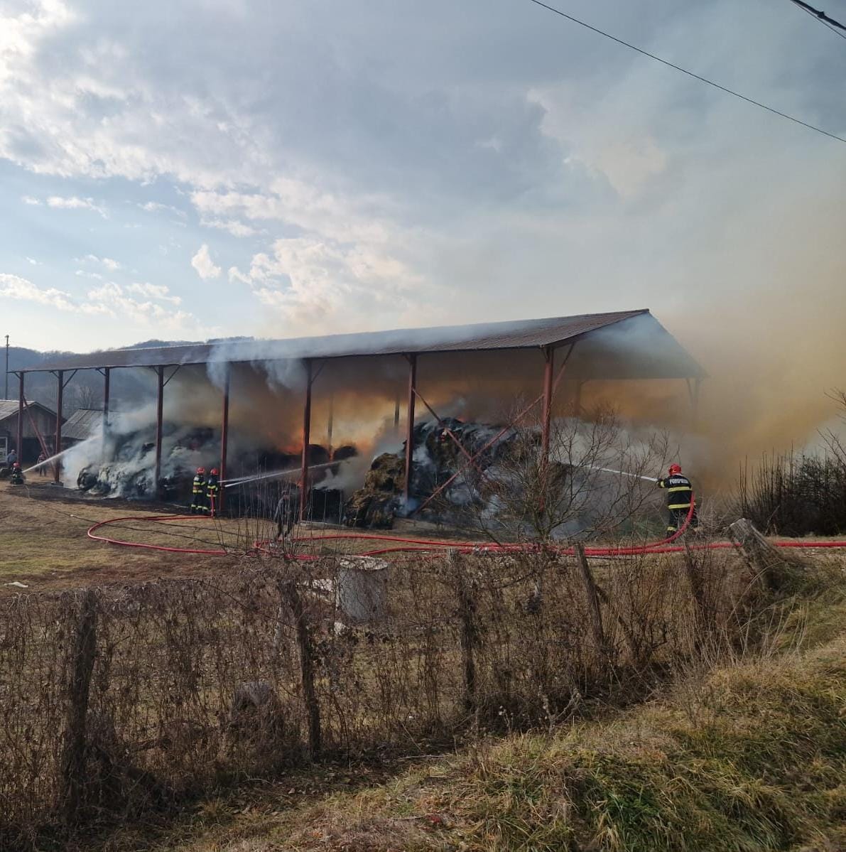 Pompierii militari vâlceni intervin, cu 3 autospeciale de stingere cu apă și spumă, pentru localizarea și lichidarea unui incendiu care se manifestă la un depozit de furaje, cu suprafața de cca 300 de mp.