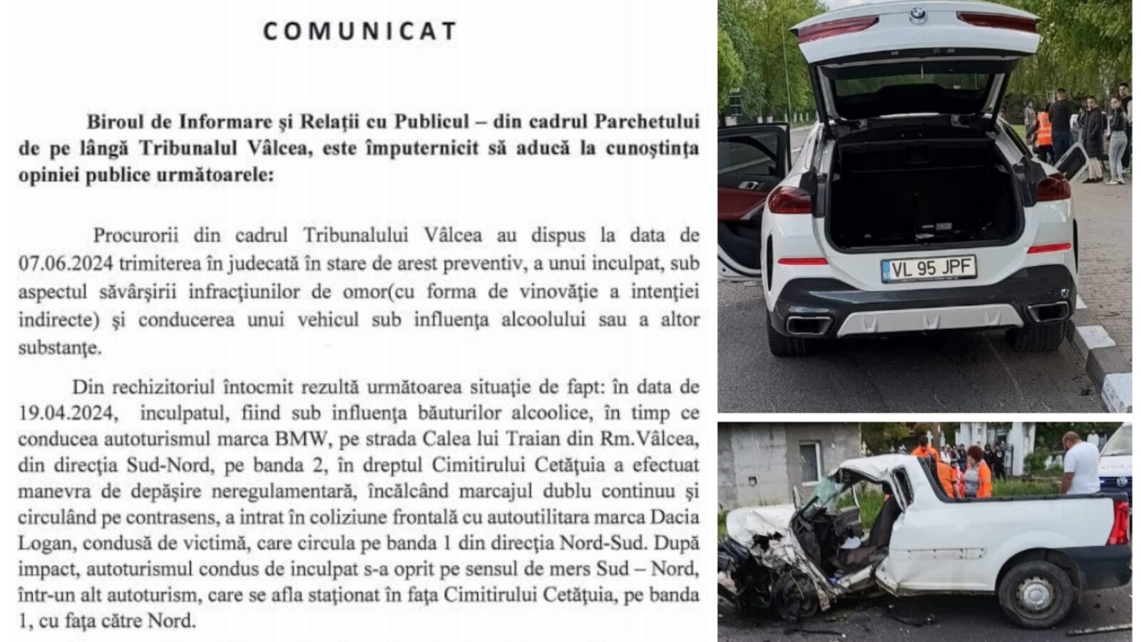 Pe data de 7 iunie, procurorii Tribunalului Vâlcea au dispus trimiterea în judecată în stare de arest preventiv, pe numele bărbatului ce a provocat accidentul rutier, la SUPECO, Vâlcea, în urma căruia, un bărbat si-a pierdut viața, în data de 19 Aprilie 2024.
