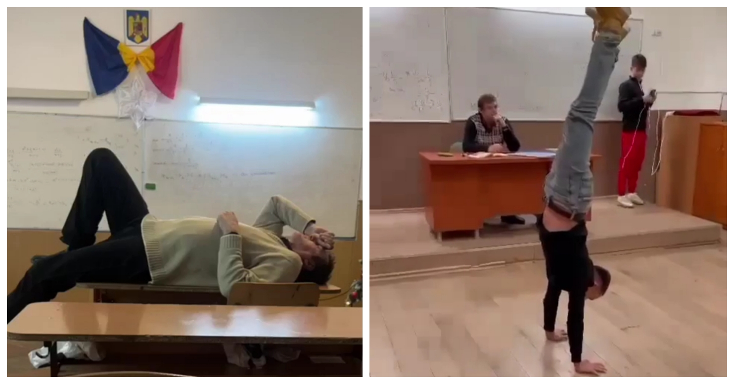 Profesorul de fizică de la Colegiul Național „Mircea cel Bătrân” din Râmnicu Vâlcea s-a întins pe catedră, în timp ce o elevă îl întreabă dacă n-ar vrea un masaj pe spate. De asemenea, tot în timpul orei de fizică, elevii fac tumbe în fața catedrei unde se afla profesorul Doru Gherzan.
