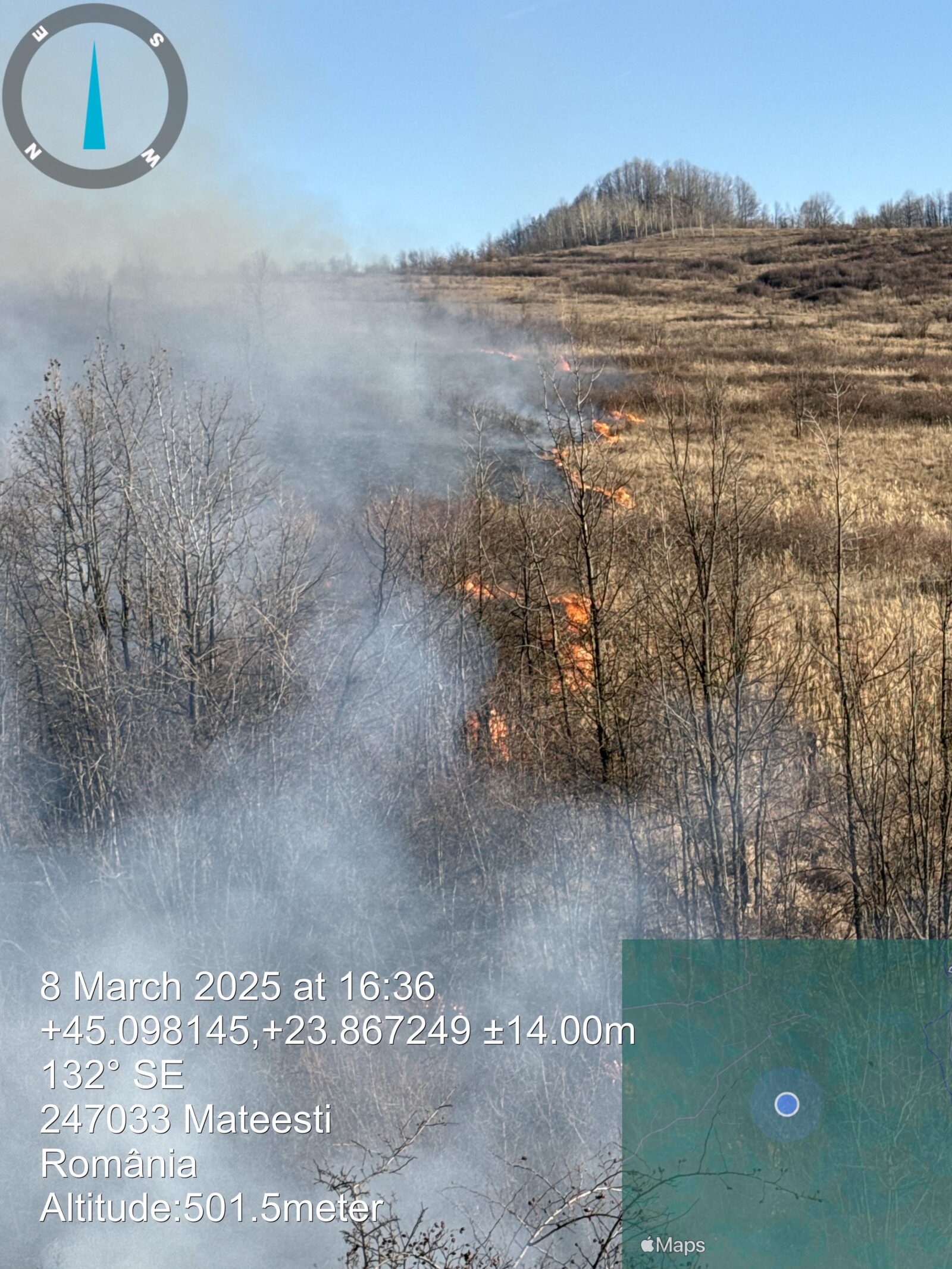 Un incendiu de proporții a izbucnit în localitățile Mateești și Slătioara, comune învecinate, din județul Vâlcea, distrugând aproximativ 130 de hectare de vegetație uscată, lăstăriș și mărăciniș. Flăcările au afectat și o stână de oi, provocând pierderi materiale semnificative: un adăpost pentru animale, o mulgătoare și cinci capre au fost mistuite de foc.