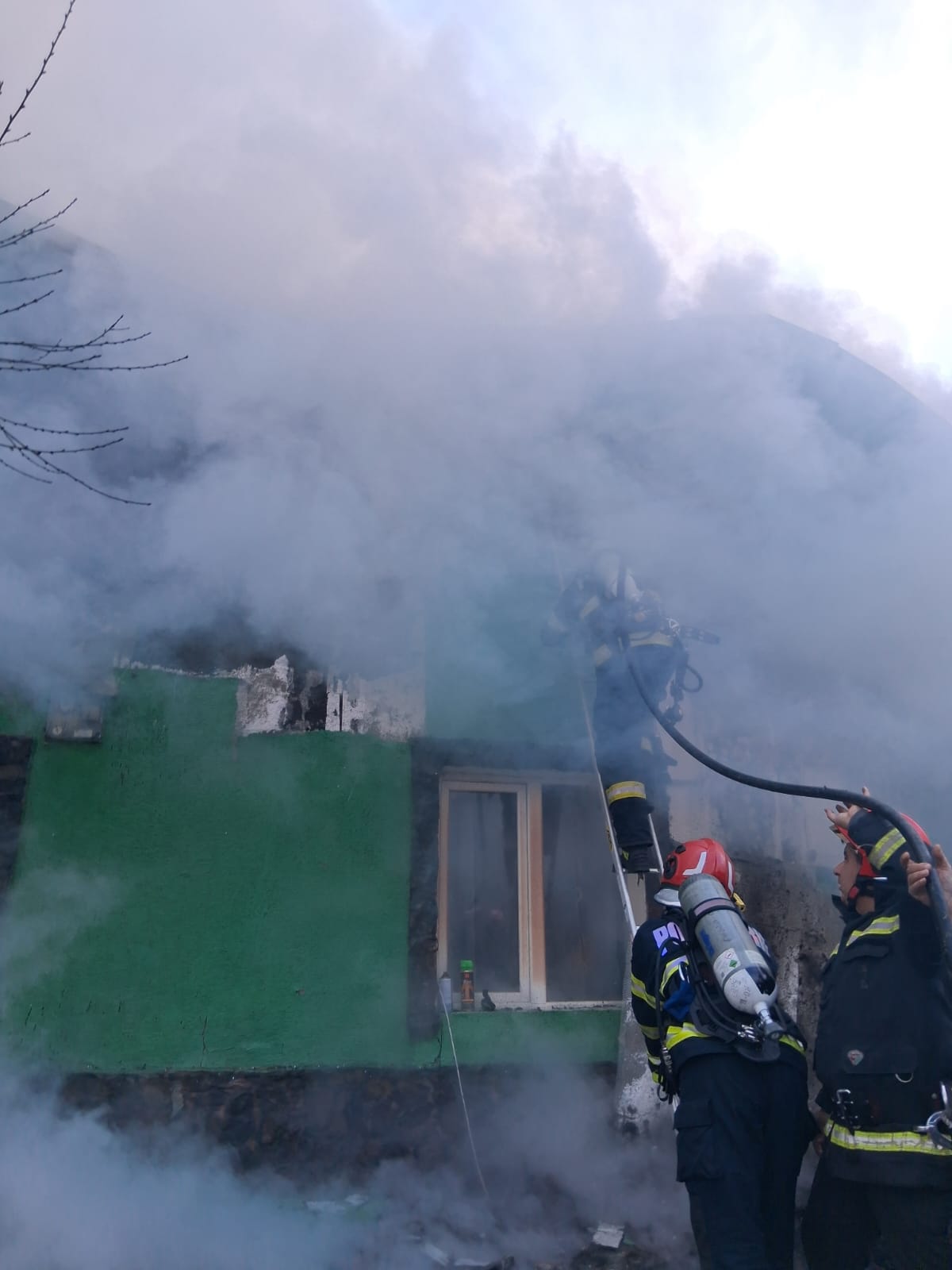 UPDATE ORA 11:45: Incendiul este lichidat. Au ars: acoperisul casei, mansarda, etajul locuintei – aprox 200 de mp, o anexa si o afumatoare. Cauza probabilă: coș de fum neizolat corespunzător. Nu au fost victime.