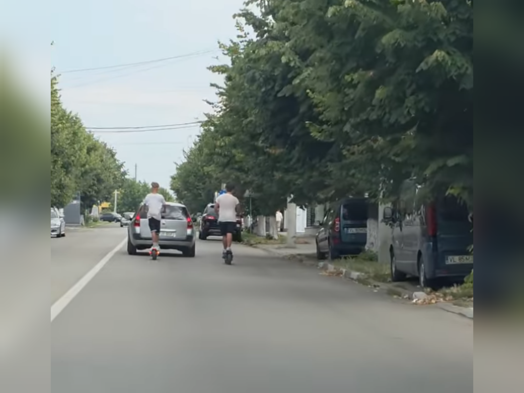 O filmare recentă postată de un cetățean din Drăgășani arată doi adolescenți pe trotinete electrice, rulând în spatele unei mașini, pe una dintre arterele principale ale orașului. Potrivit celui care a surprins imaginile, scena a avut loc seara, iar cei doi făceau parte dintr-un grup de 7-8 adolescenți care obișnuiesc să circule în acest mod riscant, uneori chiar făcând „scheme” în mers.