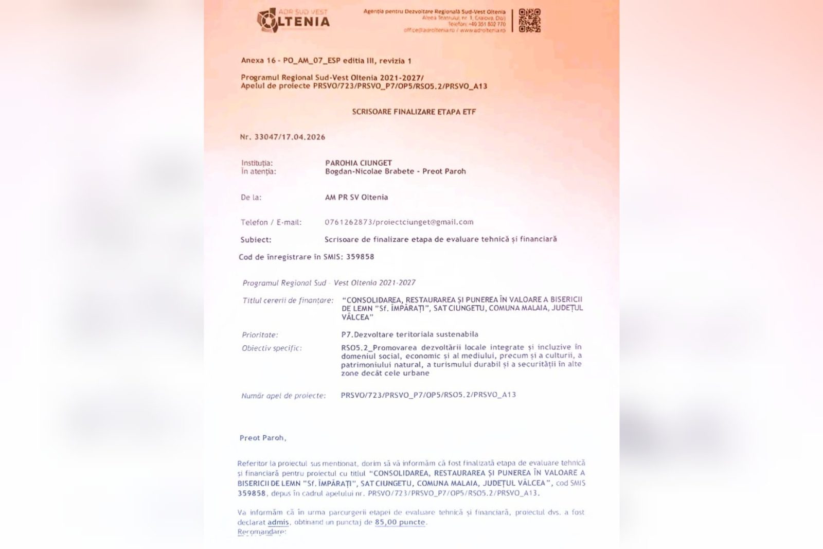 Vestea a fost confirmată printr-o adresă oficială emisă la data de 17 aprilie 2026, document care atestă calitatea documentației depuse de Parohia Ciunget sub coordonarea preotului paroh Bogdan-Nicolae Brabete. Succesul acestui demers reprezintă rodul unei colaborări strânse între autoritățile locale și reprezentanții parohiei, sub atenta supraveghere a primarului Puiu Dinculescu.
