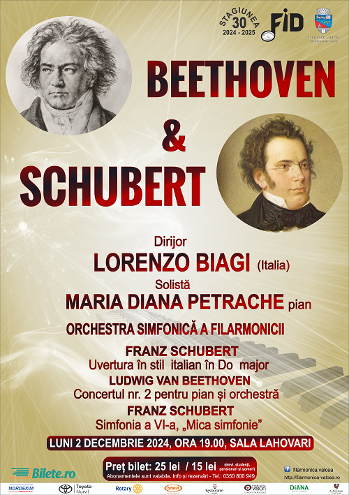 Concertul va debuta cu Uvertura în Do Major în stil italian de Franz Schubert, urmată de Concertul nr. 2 pentru pian și orchestră al lui Ludwig van Beethoven, în interpretarea talentatei pianiste Maria Diana Petrache, ca solistă. Evenimentul se va încheia cu Simfonia a VI-a, „Mica Simfonie”, compusă de Franz Schubert, o lucrare plină de rafinament și energie.