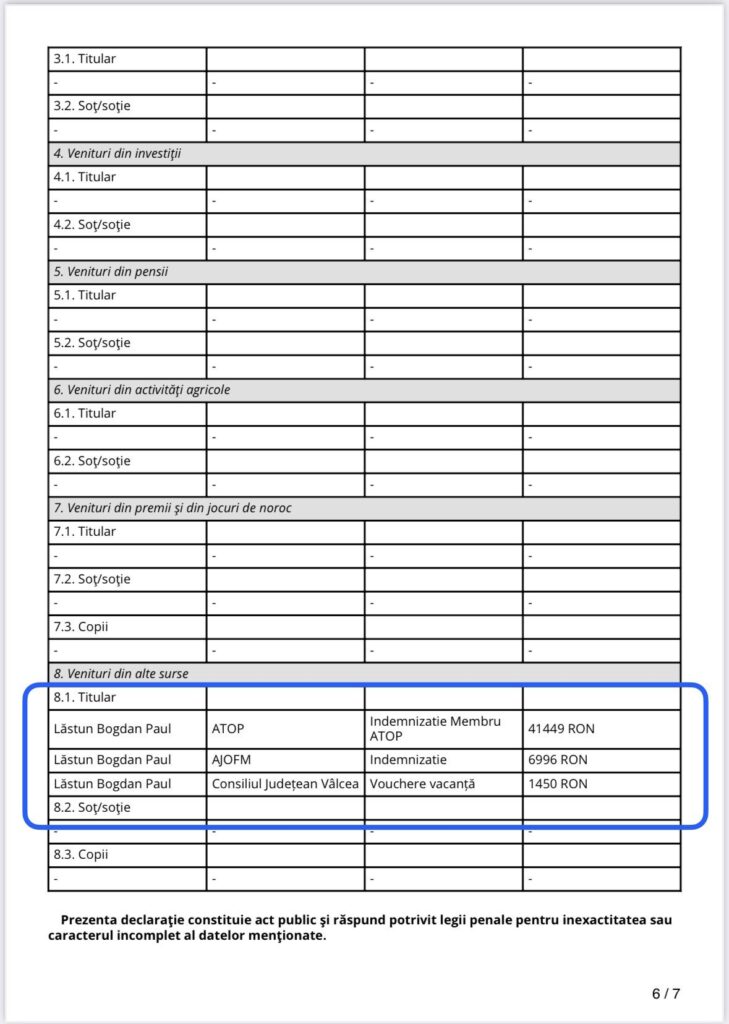 Funcția de membru ATOP nu este una onorifică. Membrii ATOP primesc o indemnizație echivalentă cu 20% din salariul președintelui Consiliului Județean Vâlcea pentru fiecare lună în care participă la o ședință de plen și una de comisie. Potrivit declarației de avere din 2024 a lui Lăstun Bogdan-Paul, venitul anual al unui „reprezentant al comunității” este de 41.449 lei, ceea ce înseamnă 3454 lei pe lună – o sumă deloc neglijabilă pentru o activitate care se rezumă adesea la câteva ședințe și semnături pe documente.
