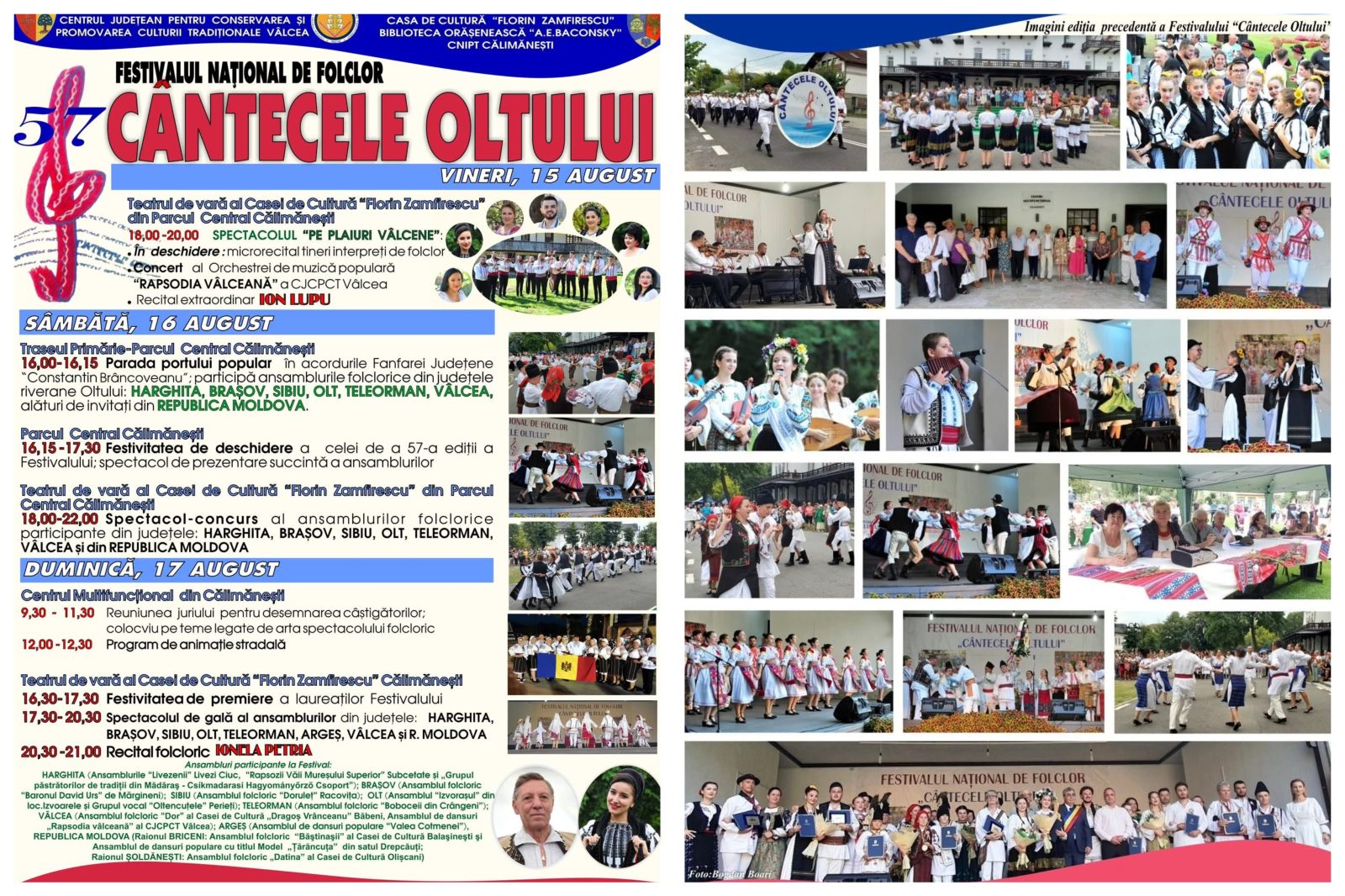 Călimăneștiul îmbracă straie de sărbătoare între 15 și 17 august 2025, când are loc cea de-a 57-a ediție a Festivalului Național de Folclor „Cântecele Oltului” – un eveniment emblematic dedicat conservării și promovării moștenirii culturale a comunităților riverane Oltului.