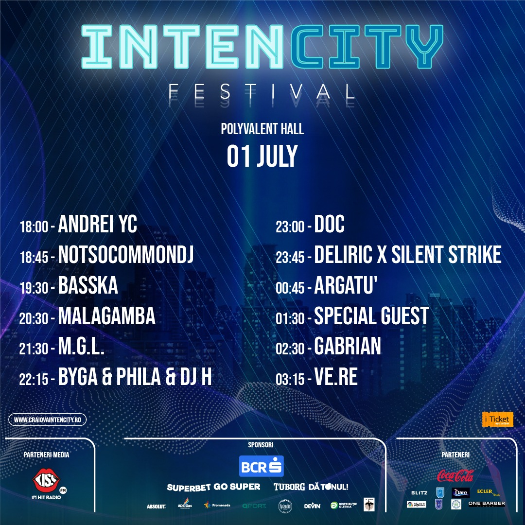 Cea de-a doua ediție a Festivalului IntenCity aduce în oraș nume renumite din muzica internațională. Festivalul va avea loc în intervalul 30 iunie – 2 iulie, pe două scene amplasate în Complexul Sportiv Craiova (Stadionul Ion Oblemenco) și la Sala Polivalentă.