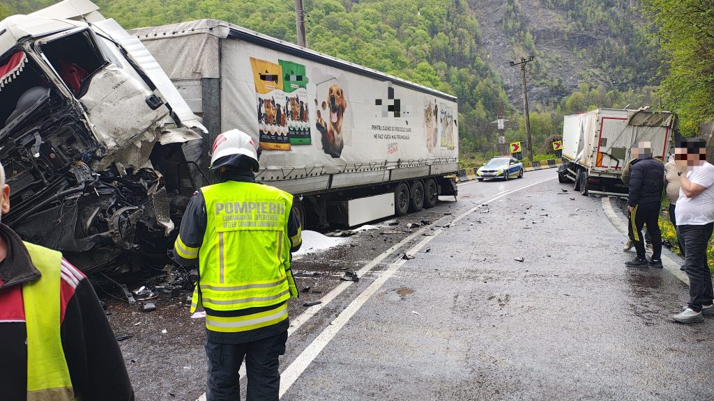 Accident grav pe DN7, la Brezoi: două camioane implicate, o persoană încarcerată, trafic blocat total în zona Lotrișor