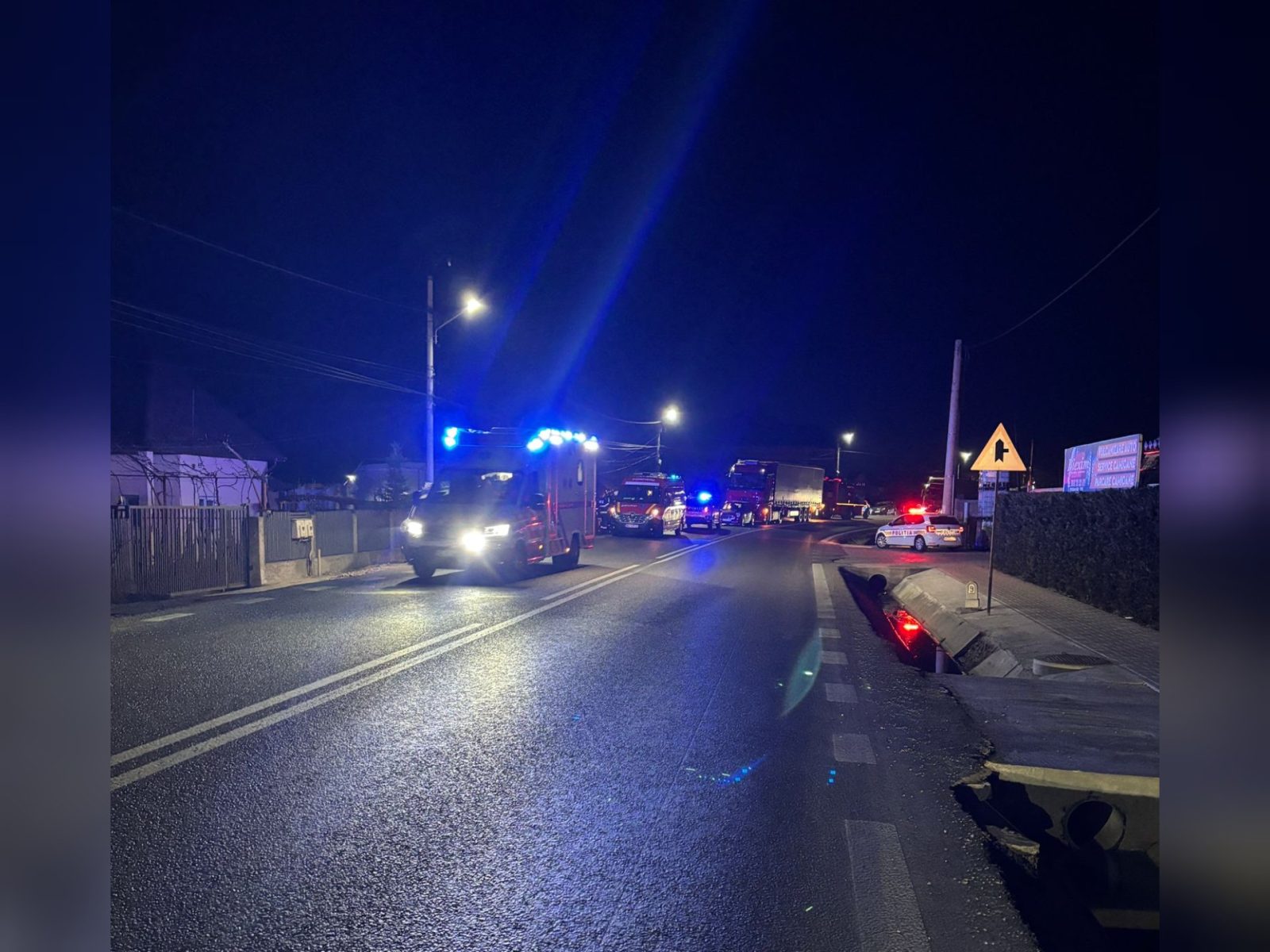 Potrivit informațiilor transmise de Inspectoratul de Poliție Județean Vâlcea, în eveniment sunt implicate un autoturism și un ansamblu de vehicule de tip TIR.