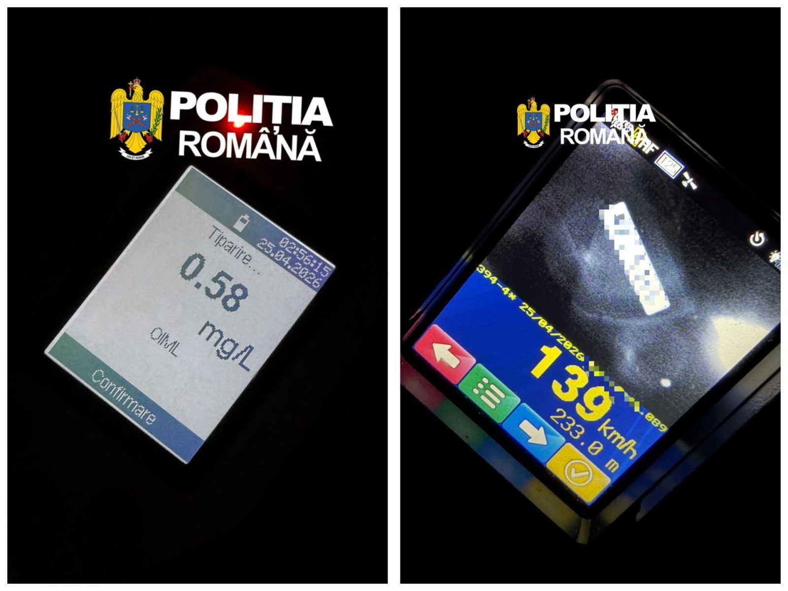Situația devine și mai gravă în contextul în care șoferul nu era doar grăbit, ci și băut. Testarea cu aparatul etilotest a indicat o valoare de 0,58 mg/l alcool pur în aerul expirat, un nivel care afectează serios reflexele, capacitatea de reacție și discernământul la volan.