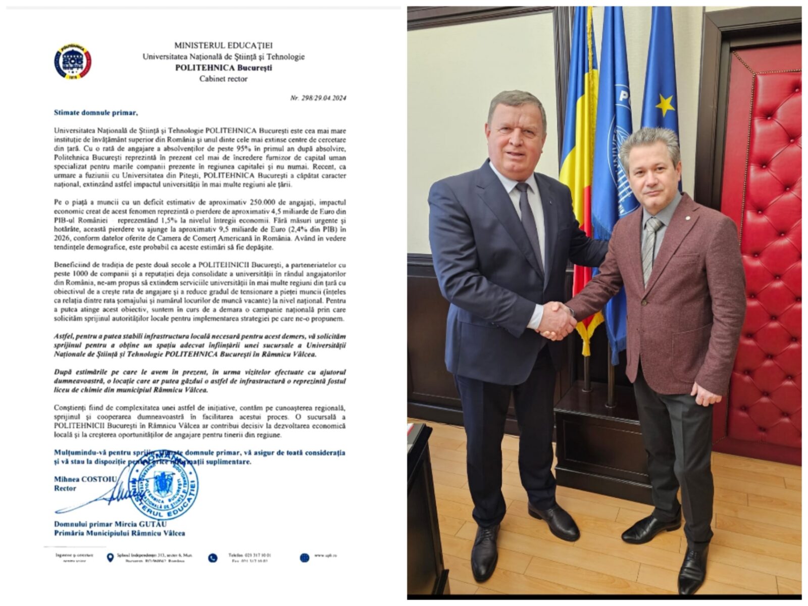 Printr-o scrisoare transmisă primarului Mircia Gutău înainte de Paști, rectorul Universității Naționale de Știință și Tehonologie Politehnica București, Mihnea Costoiu, a confirmat decizia instituției de învățământ superior de a înființa o sucursală la Râmnicu Vâlcea, care, într-o primă fază (până la reabilitarea terenurilor și construcțiilor deținute la limita cu comuna Vlădești), își va desfășura cursurile în spațiile fostului liceu Oltchim.