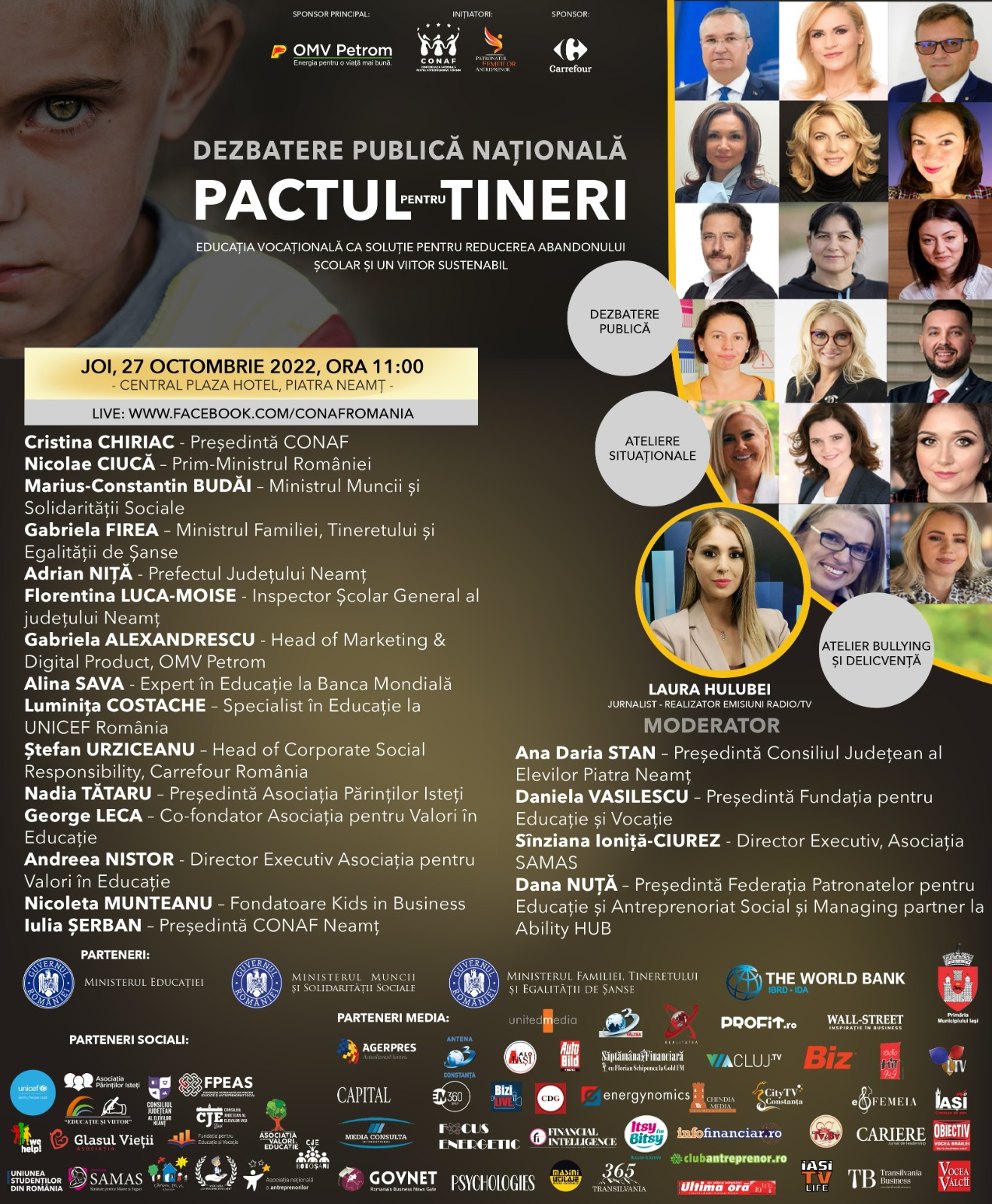 Confederația Națională pentru Antreprenoriat Feminin (CONAF)*, va organiza în data de 27 octombrie 2022 la Piatra Neamț a doua dezbatere a proiectului național „Pactul pentru Tineri”, în parteneriat cu Ministerul Educației, Ministerul Familiei, Tineretului și Egalității de Șanse, Ministerul Muncii și Solidarității Sociale, UNICEF și Banca Mondială.