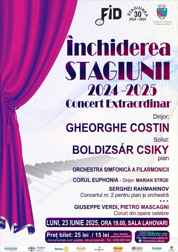 Luni, 23 iunie 2025, la ora 19:00, în Sala Lahovari, va avea loc un concert extraordinar ce va încheia stagiunea artistică 2024-2025 a Filarmonicii «Ion Dumitrescu» Vâlcea. Evenimentul promite să fie unul memorabil, sub bagheta dirijorului Gheorghe Costin, cu solistul de renume internațional Boldizsár Csiky la pian.