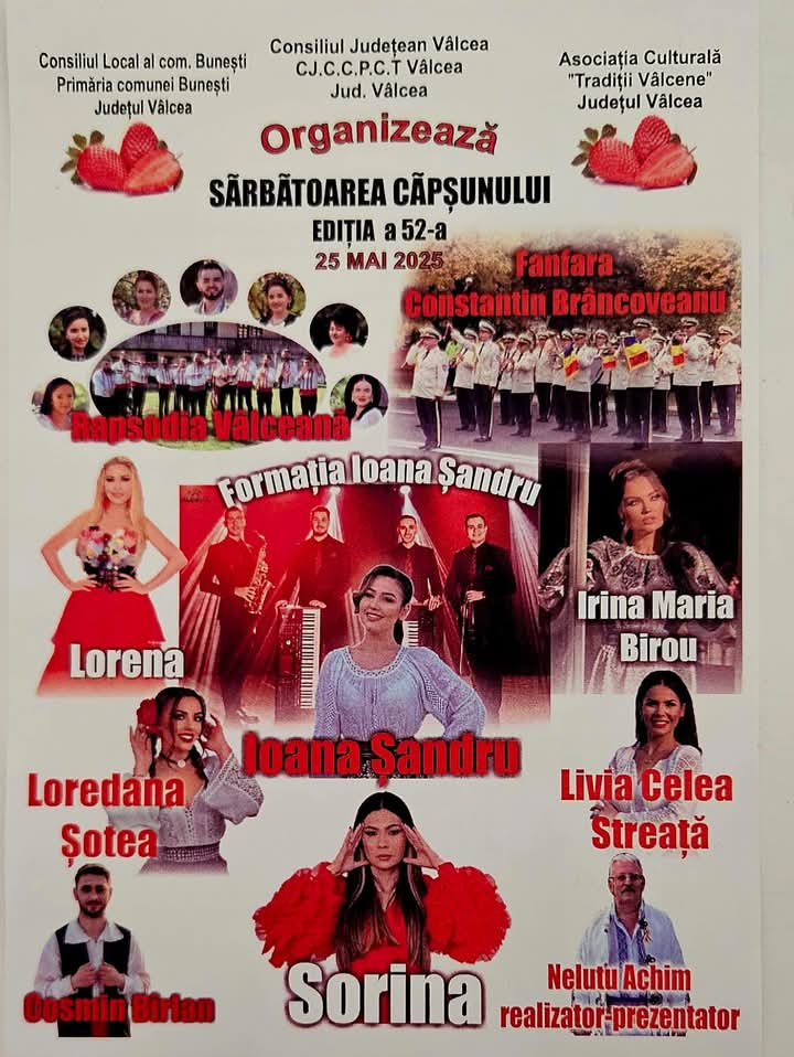 În ciuda vremii capricioase care a afectat în acest an nu doar cultura căpșunului, ci și alte culturi agricole, comuna Bunești a ales să meargă mai departe cu una dintre cele mai îndrăgite tradiții locale: Sărbătoarea Căpșunului. Evenimentul va avea loc duminică, 25 mai 2025, în centrul localității Bunești, începând cu ora 10:00, și promite o zi întreagă de voie bună, muzică, tradiție și mândrie locală.