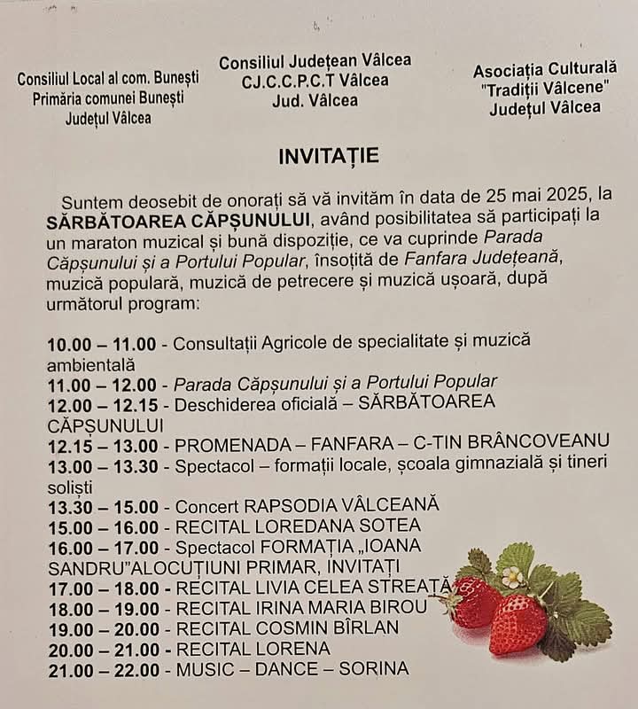„Dragi locuitori ai comunei Bunești și nu numai, vă invităm cu drag să luați parte la Sărbătoarea Căpșunului, un eveniment de suflet dedicat tradiției, comunității și – bineînțeles, delicioaselor căpșuni!”, transmit organizatorii.