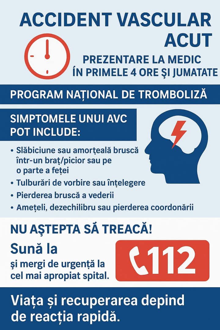 Un accident vascular cerebral (AVC) este o urgență medicală majoră, iar intervenția rapidă poate face diferența între o recuperare completă și complicații ireversibile. Medicii atrag atenția asupra importanței prezentării la spital în primele 4 ore și jumătate de la apariția primelor semne. În acest interval, pacientul poate beneficia de tromboliză, un tratament eficient disponibil în cadrul Programului Național de Tromboliză, în care este inclus și Spitalul Județean de Urgență Vâlcea.